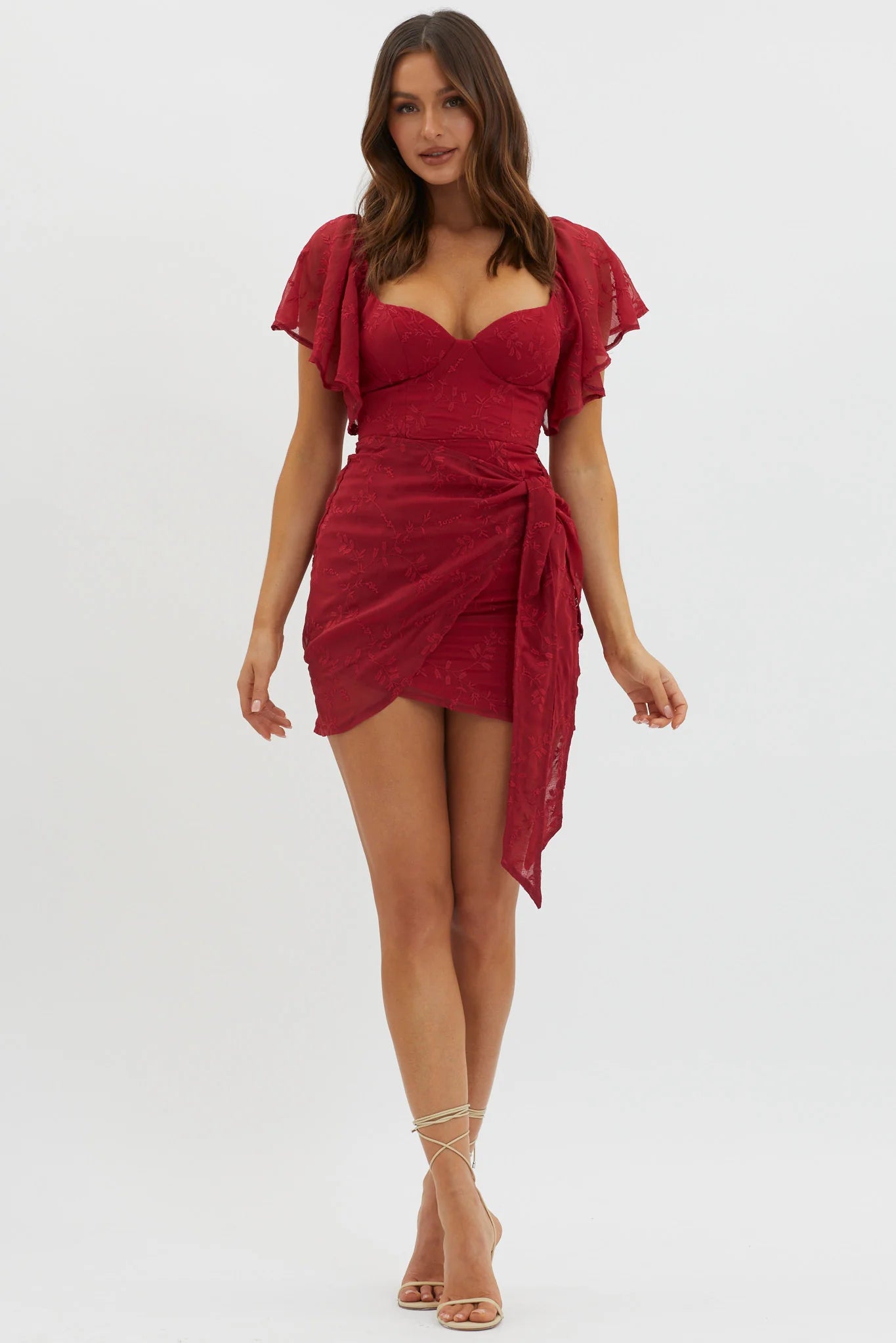 Home Aphrodite Molded Bust Angel Sleeve Wrap Dress Embroidered Red