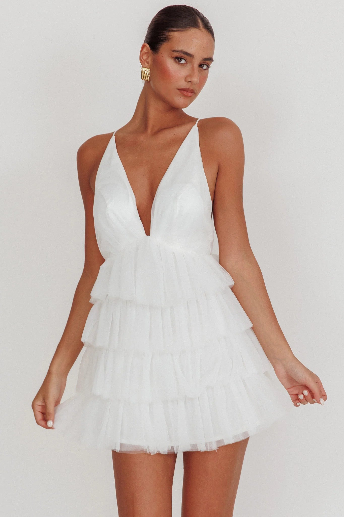 another style within 30 days of receiving your order.You will steal the show in our gorgeous Auguste mini dress. Featuring a plunging neckline and tiered ruffle bodice. Wear it to a bachelorette or a special birthday celebration. Team it with nude heels and a clutch for a look that'll have you flooded with compliments.