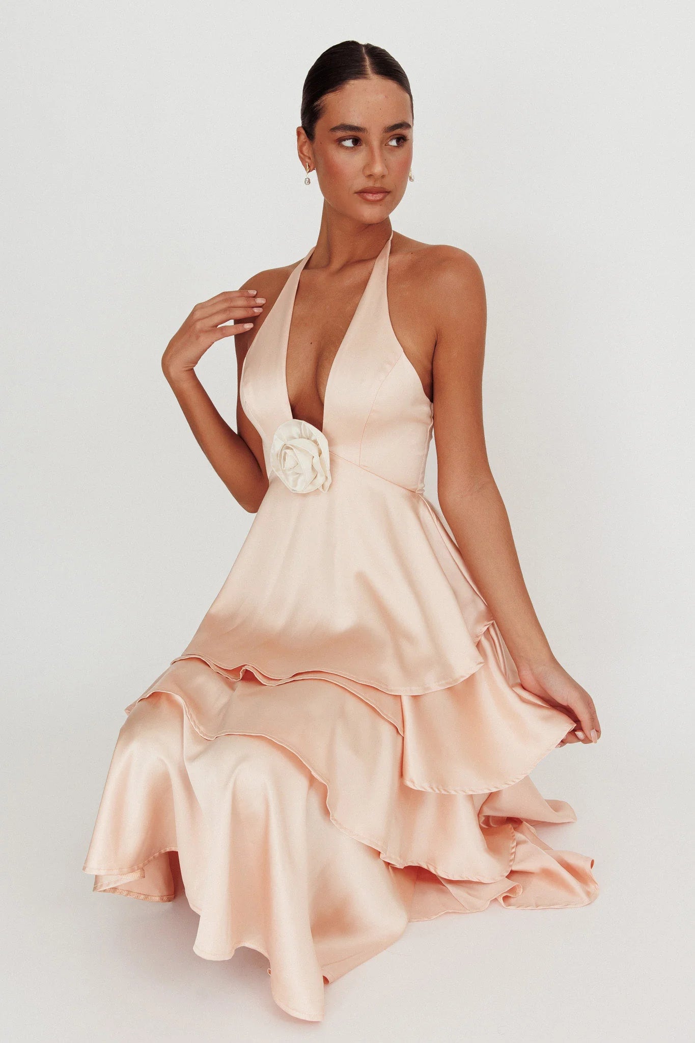 another style within 30 days of receiving your order.Heads will turn when you float by in our gorgeous Catalina maxi dress. We are obsessed with its tiered ruffle design and contrast rosette. Perfect for a date night or birthday party. Team it with strappy heels and a tote for an unforgettable look.