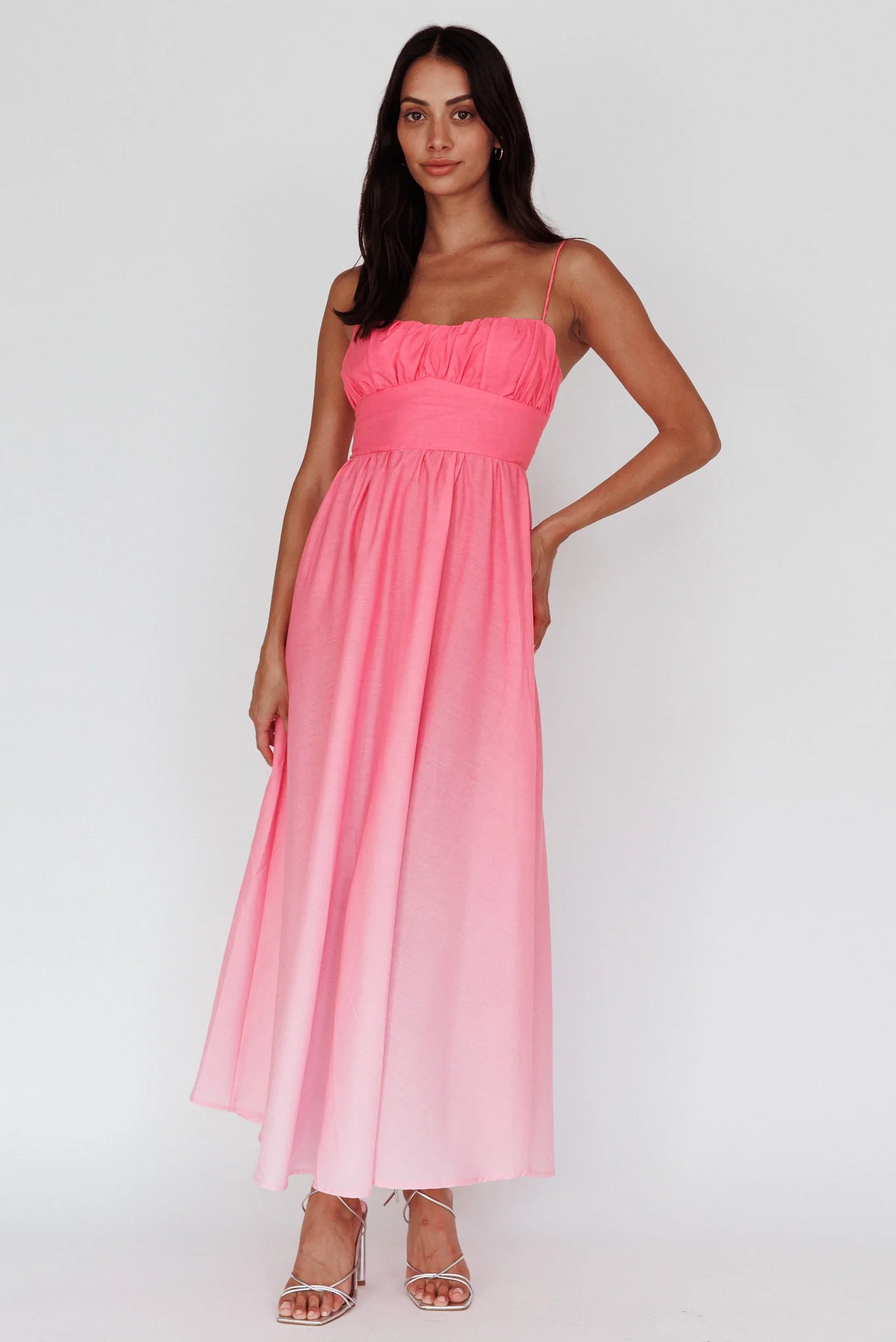 another style within 30 days of receiving your order.Make a statement in our pretty Clarabelle maxi dress. Featuring a gorgeous, gradient fabric and gathering detail in the bust. It's perfect for a wedding or lunch date with your besties. Team it with strappy, white mules and a saddle bag for a chic look we are loving.