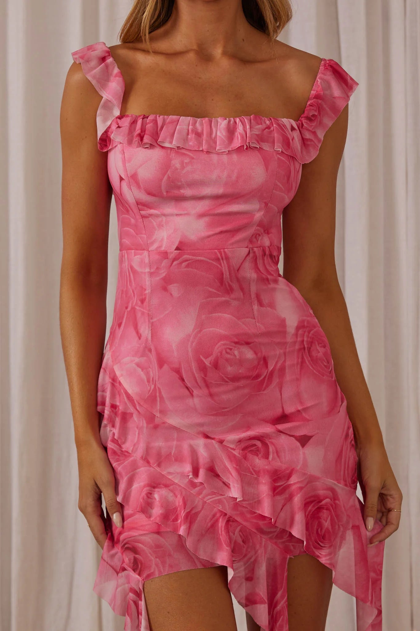 another style within 30 days of receiving your order.Get their attention in our Floating On Clouds mini dress. It features on-trend ruffles and a pretty floral print and is perfect for your next gals' night out! Team it with strappy, pink heels and a saddle bag to complete the look.