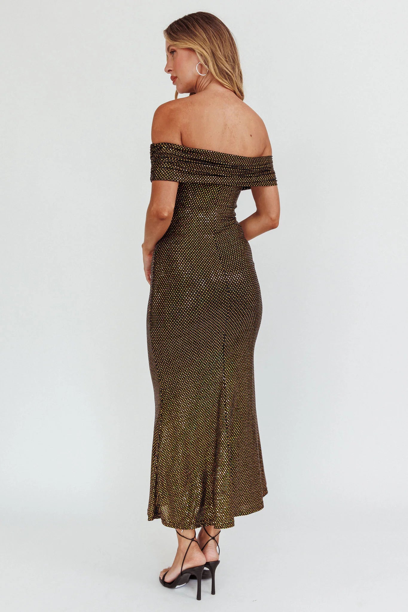 another style within 30 days of receiving your order.The room will light up when you walk in wearing our stunning Kailey maxi dress. It features a chic, off-shoulder design and sparkly spangles throughout. It's just what you need for that glam, special event you have coming up! Team it with black, strappy heels and a clutch for a look that will leave them speechless.