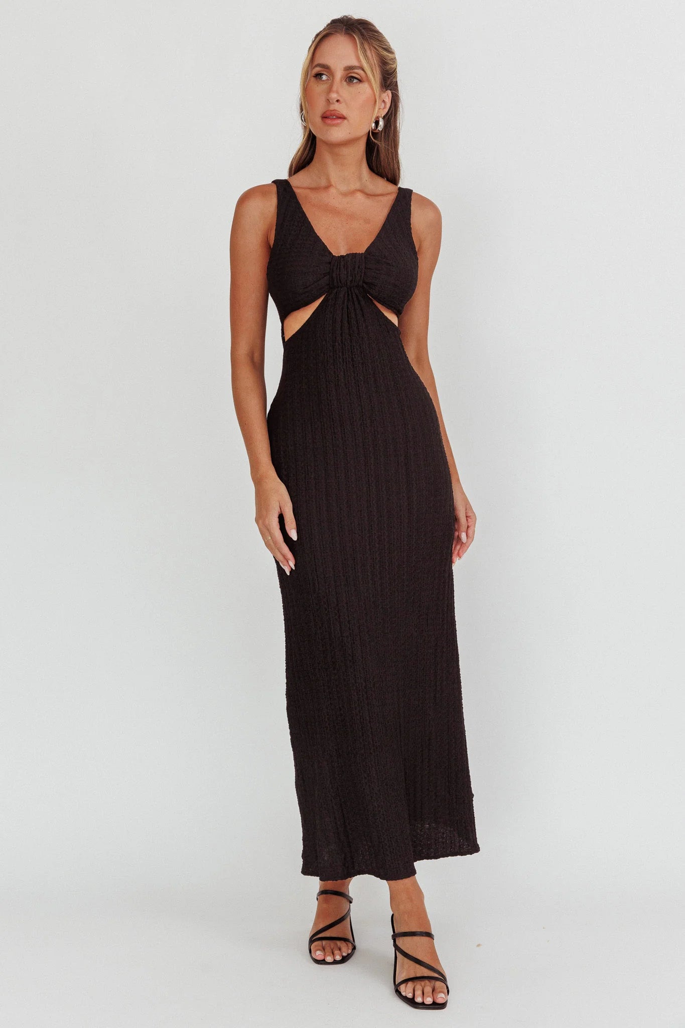 another style within 30 days of receiving your order.Make an entrance in our chic Kharissa maxi dress. It features a textured, stretch fabric and cut-out detail in the bodice. It's perfect for a flirty date night or cocktails with your girls. Team it with pointed-toe kitten heels and a hobo bag for an on-trend look we are loving.