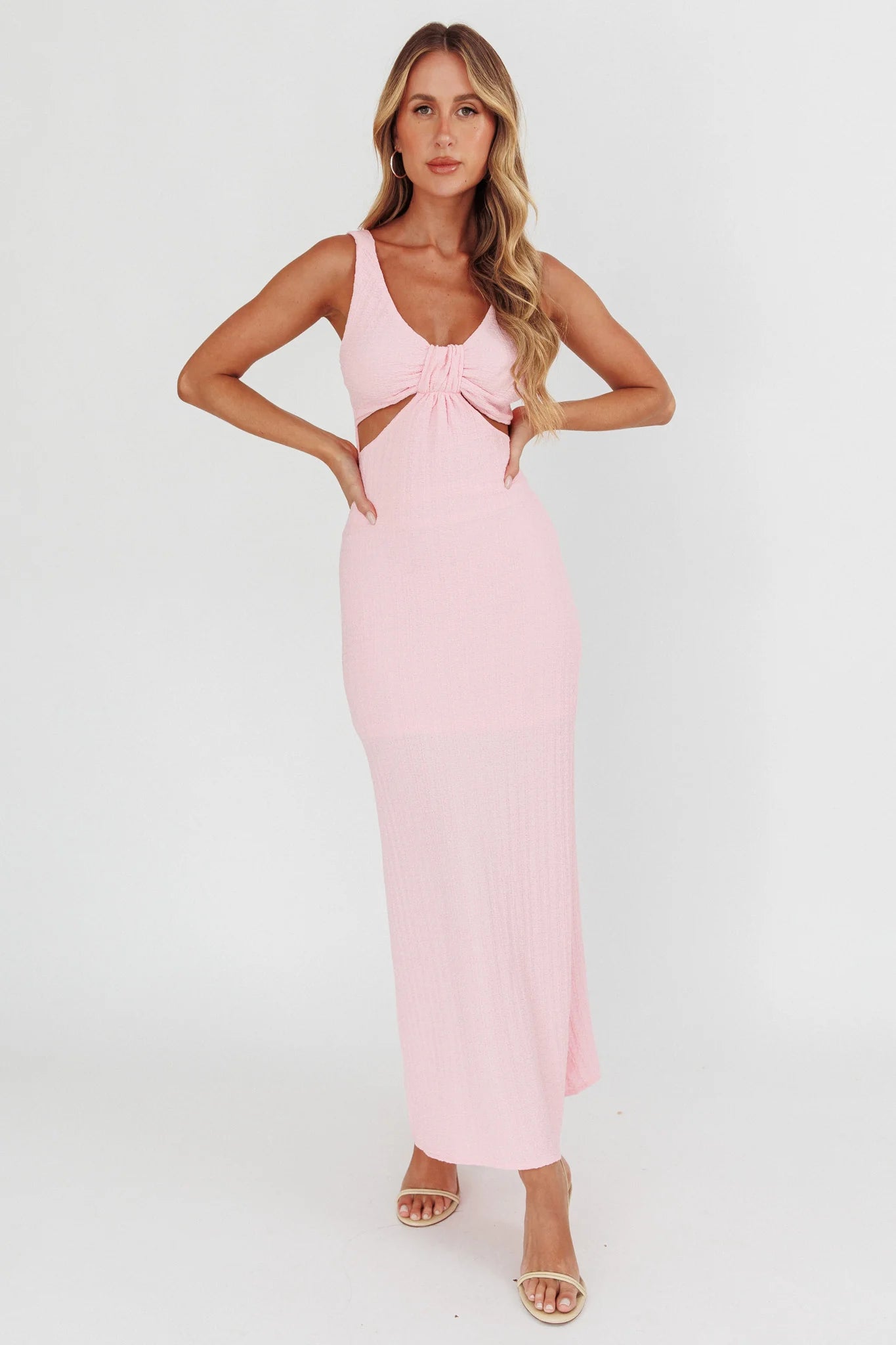 another style within 30 days of receiving your order.Make an entrance in our chic Kharissa maxi dress. It features a textured, stretch fabric and cut-out detail in the bodice. It's perfect for a flirty date night or cocktails with your girls. Team it with pointed-toe kitten heels and a hobo bag for an on-trend look we are loving.