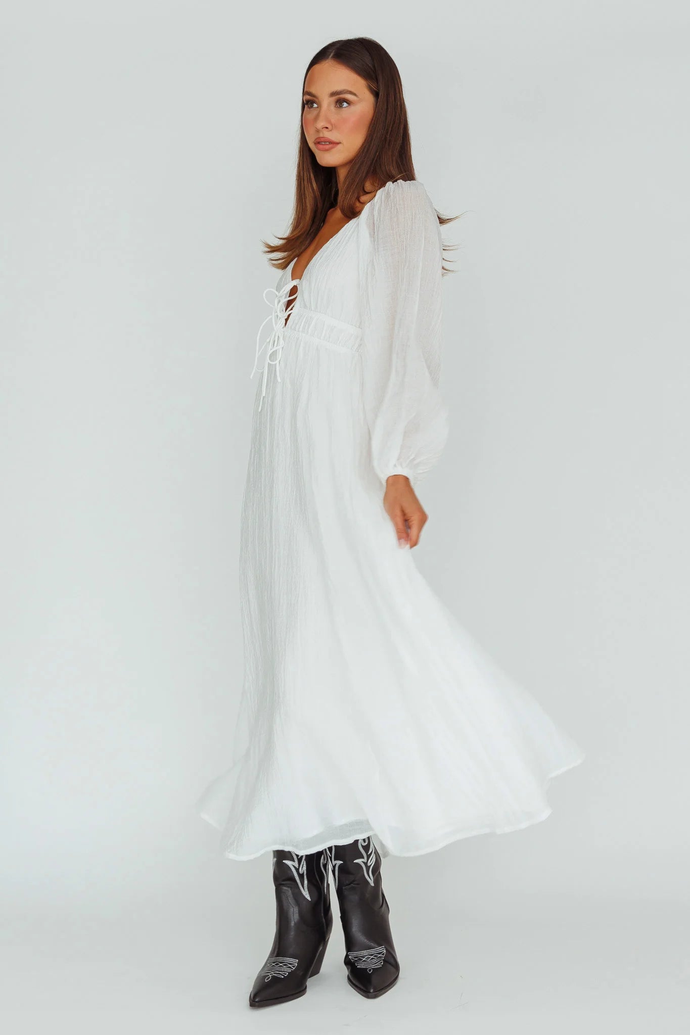 another style within 30 days of receiving your order.Float through your day in our pretty Kylin maxi dress. Featuring long, balloon sleeves and a tied bust, it's perfect for sunny weekends strolling the farmers' markets or coffee dates with your girls. Team it with sandals and a woven tote for a look we are loving.