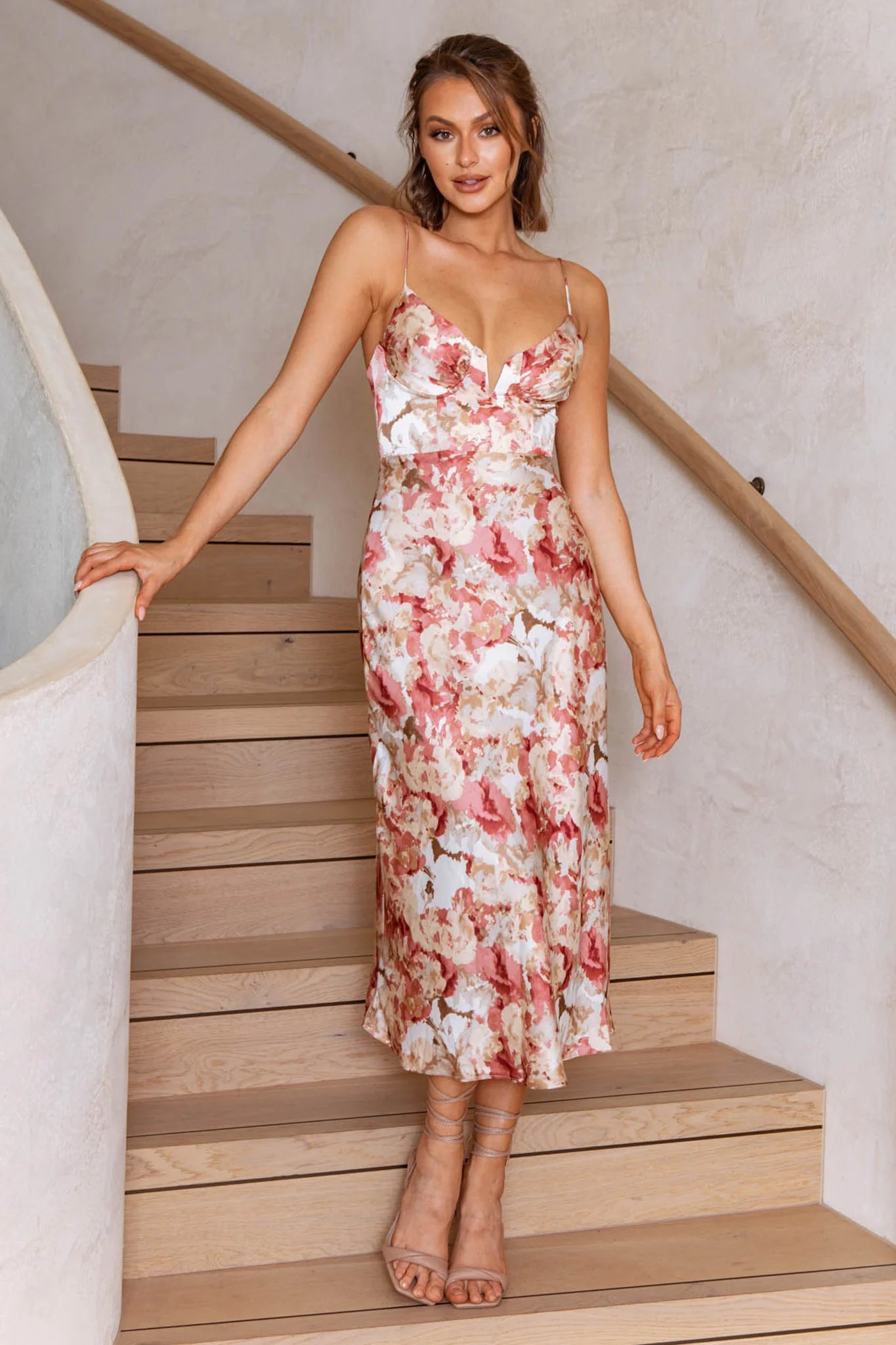 Home Lake Como Fitted Bodice Cami Strap Midi Dress Abstract Print Rose