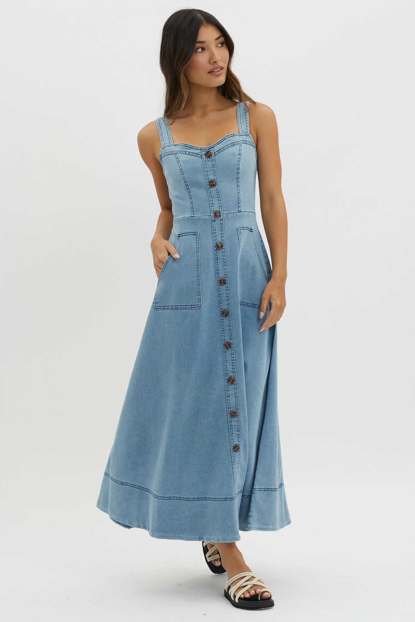 another style within 30 days of receiving your order.Breeze through your day in our pretty Laureen maxi dress. Featuring large front pockets and a faux button placket. It's perfect for a lunch date with your love. Team it with mules and a tote for a chic look that will turn heads.