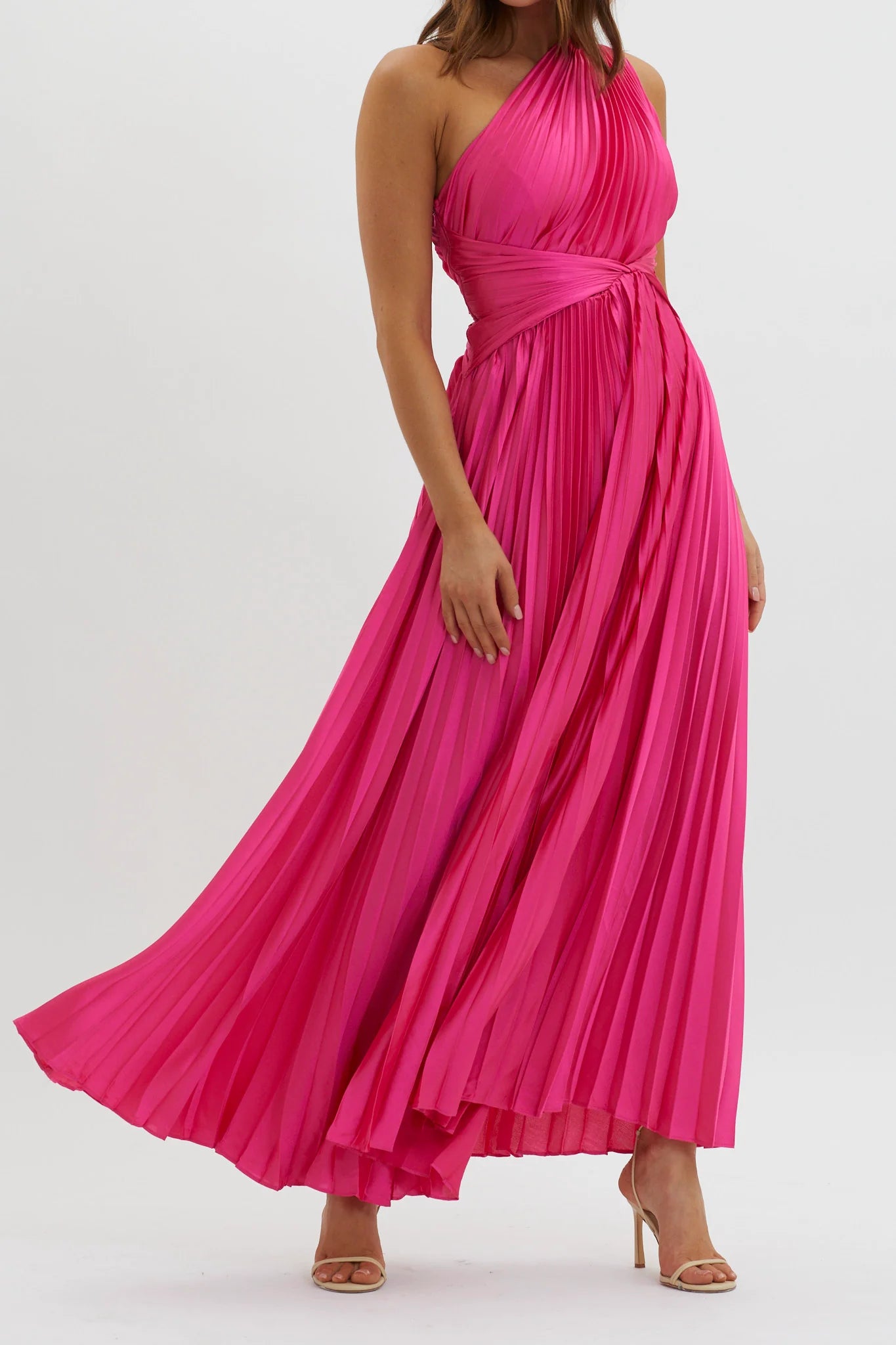 another style within 30 days of receiving your order.Make a grand entrance in our gorgeous Laxmi maxi dress. We are in love with its stunning accordion pleat, satin fabric and one-shoulder style. It's perfect for a wedding or a special event. Team it with a statement purse and chandelier earrings for an unforgettable look.