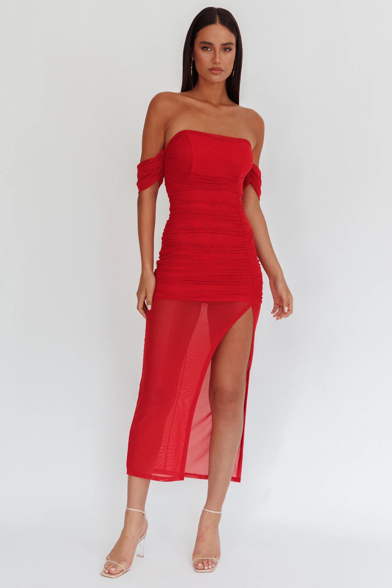 another style within 30 days of receiving your order.You'll be flooded with compliments in our stunning Melonie maxi dress. It features a mesh overlay and off-shoulder design. It's perfect for an anniversary dinner or a glam night out with your girls. Team it with strappy, tie-up heels and a clutch to complete the look.