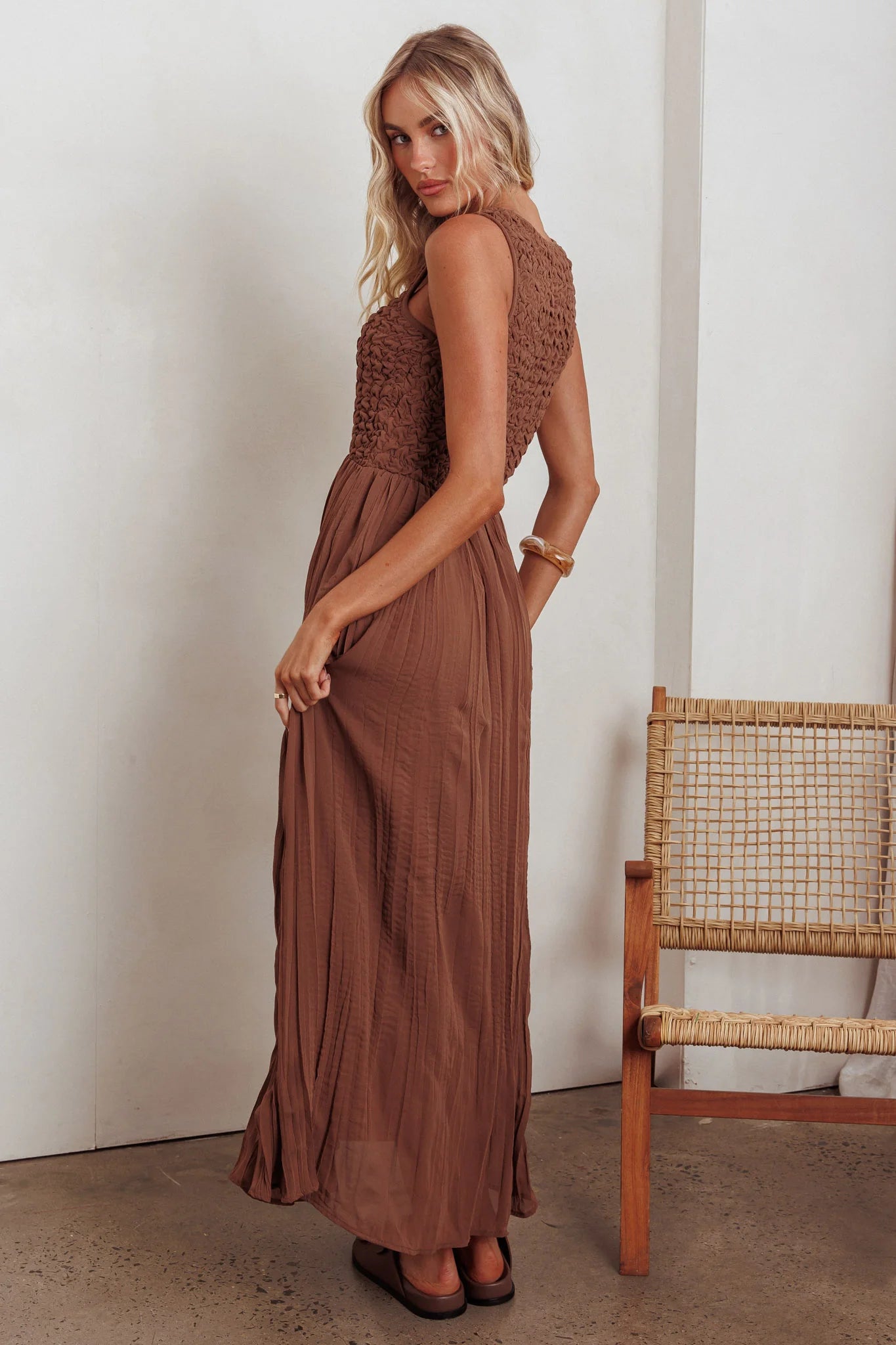 another style within 30 days of receiving your order.Float on by in our super cute Mirella maxi dress. It features a smocked bodice and pleated texture skirt. Perfect for lazy weekends strolling the farmers' market in style. Team it with sandals and a tote for a look we are all about.