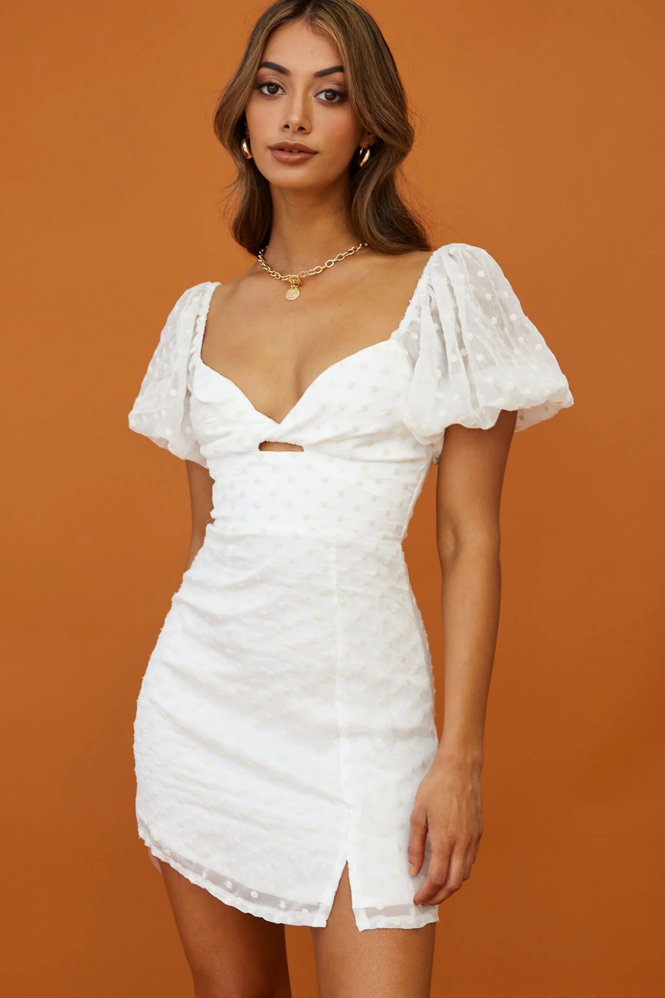 another style within 30 days of receiving your order.Hey there, cutie! We are majorly crushing on our super cute Molli dress. Featuring adorable, sheer puff sleeves, delicate floral embroidery and a twist accent in the bust. Wear it to lunch dates with your gal pals teamed with white sneakers and a tote for a playful look.