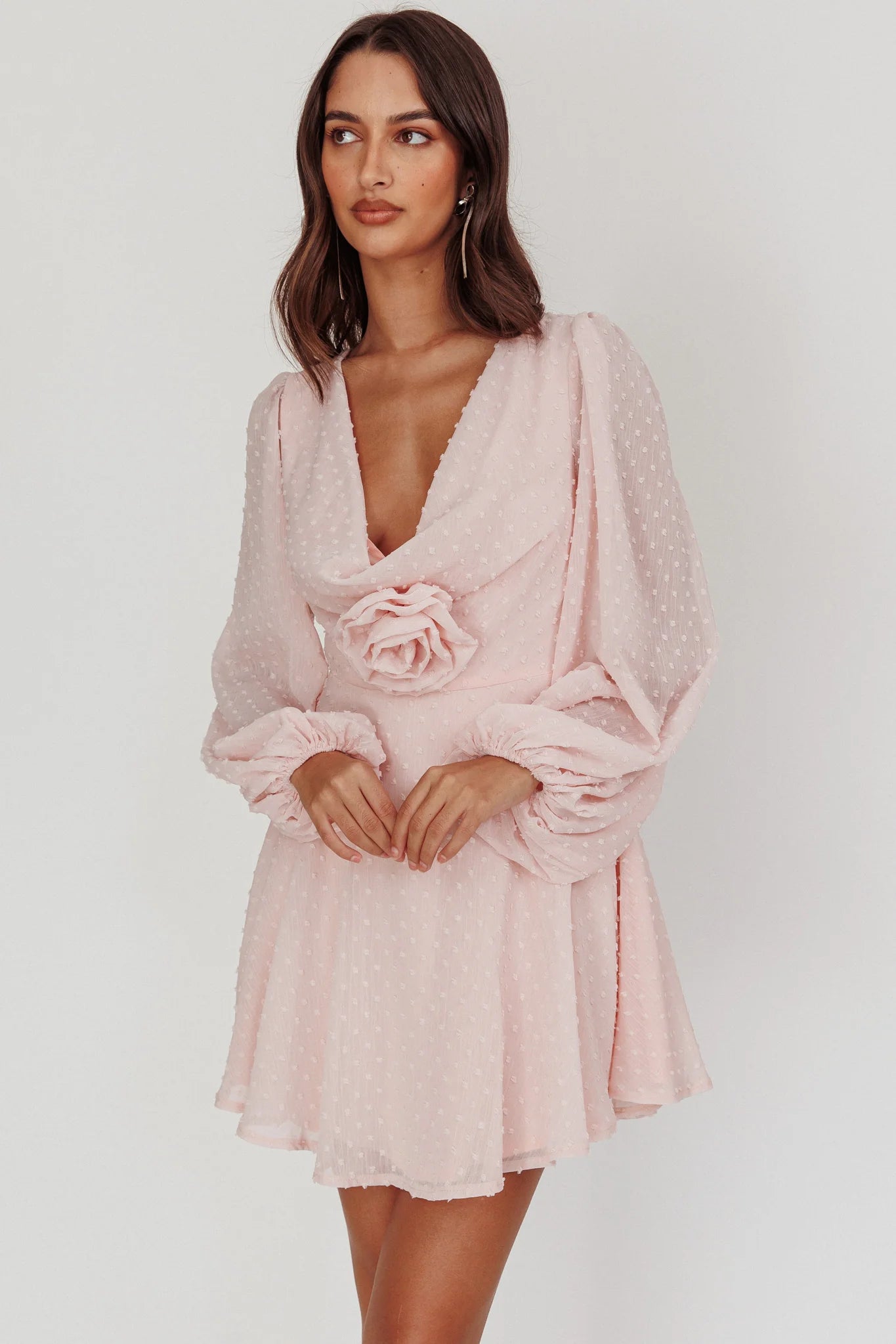 another style within 30 days of receiving your order.Hello, gorgeous! We've fallen head over heels for our pretty Open Heart mini dress. It features a detachable rosette and long sleeves and is perfect for a wedding or a birthday brunch with your besties. Team it with nude heels and a clutch for an unforgettable look.