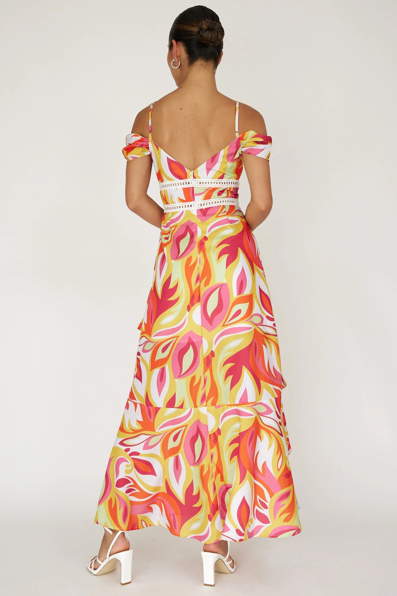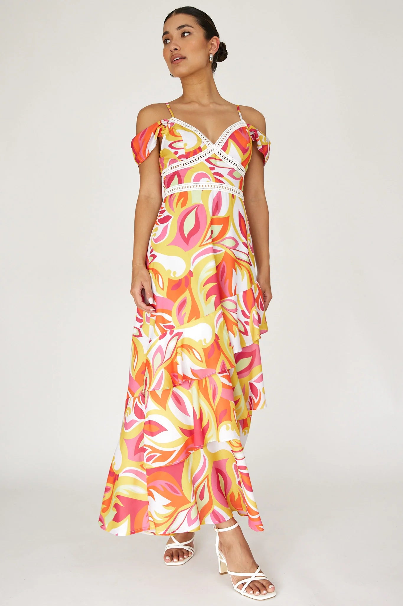 another style within 30 days of receiving your order.Float through your weekend in our gorgeous Seina midi dress. It features an off-shoulder design and tiered ruffles in the skirt. Wear it to brunch with your girls or a Summer wedding! Team it with white heels and a clutch for a head-turning look.