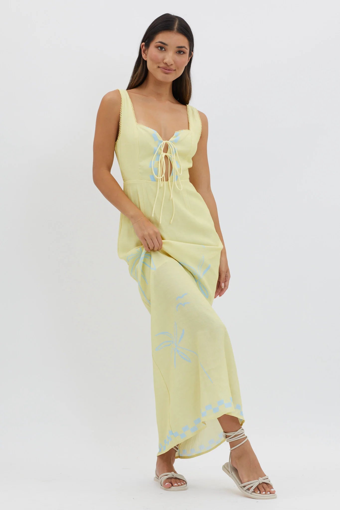 another style within 30 days of receiving your order.Breeze through the weekend in our adorable Sun Valley maxi dress. We are obsessed with its tie detail in the bodice and delicate lace trim. It's perfect for champagne brunch with your girls teamed with kitten heels and a saddle bag for a sophisticated look that will turn heads.