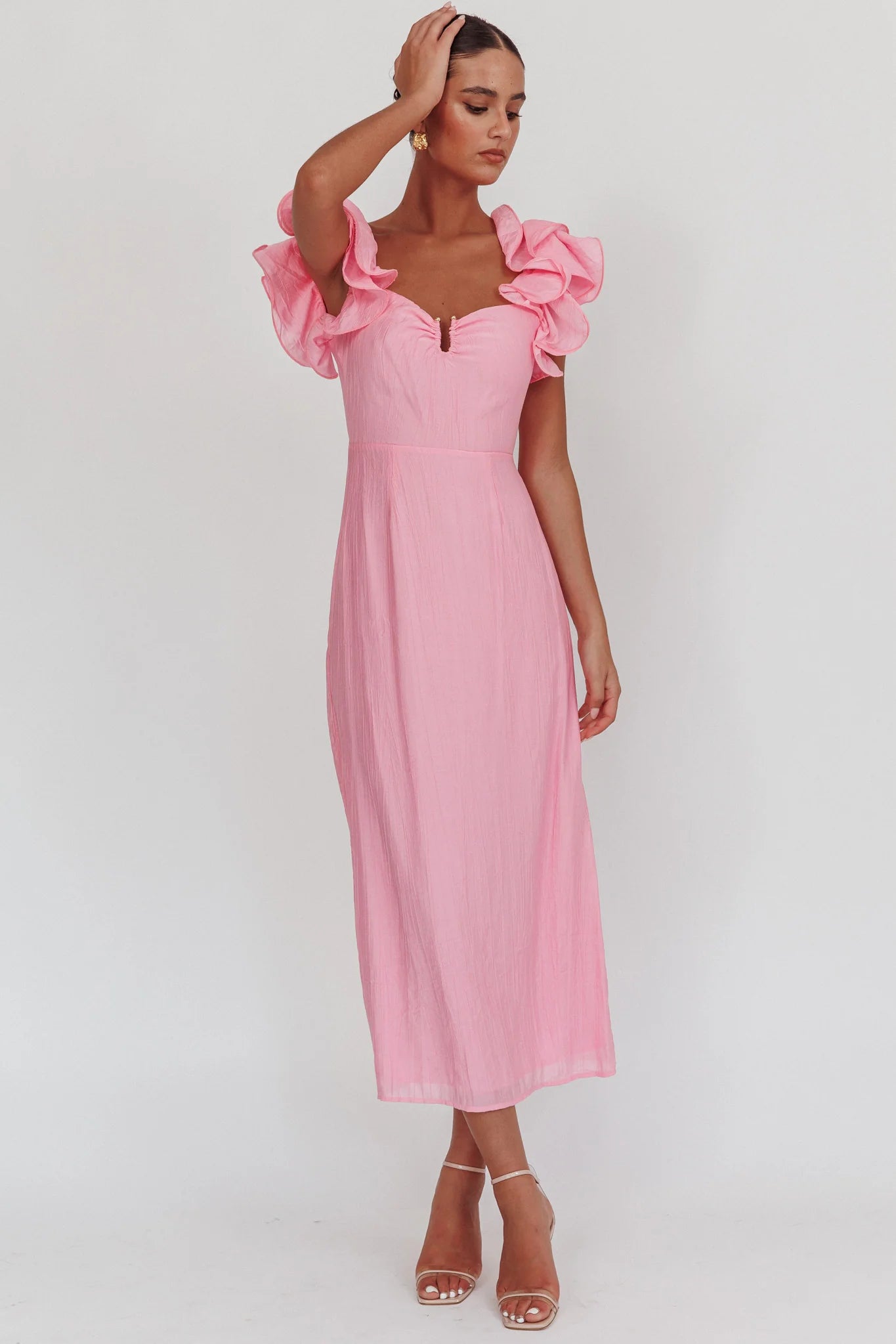 another style within 30 days of receiving your order.Turn heads in our gorgeous Sunday Dreams maxi dress. It features the sweetest ruffle straps and U hardware in the bust. It's perfect for a wedding or romantic anniversary dinner. Team it with strappy, nude tie-up heels and a clutch for an unforgettable look.