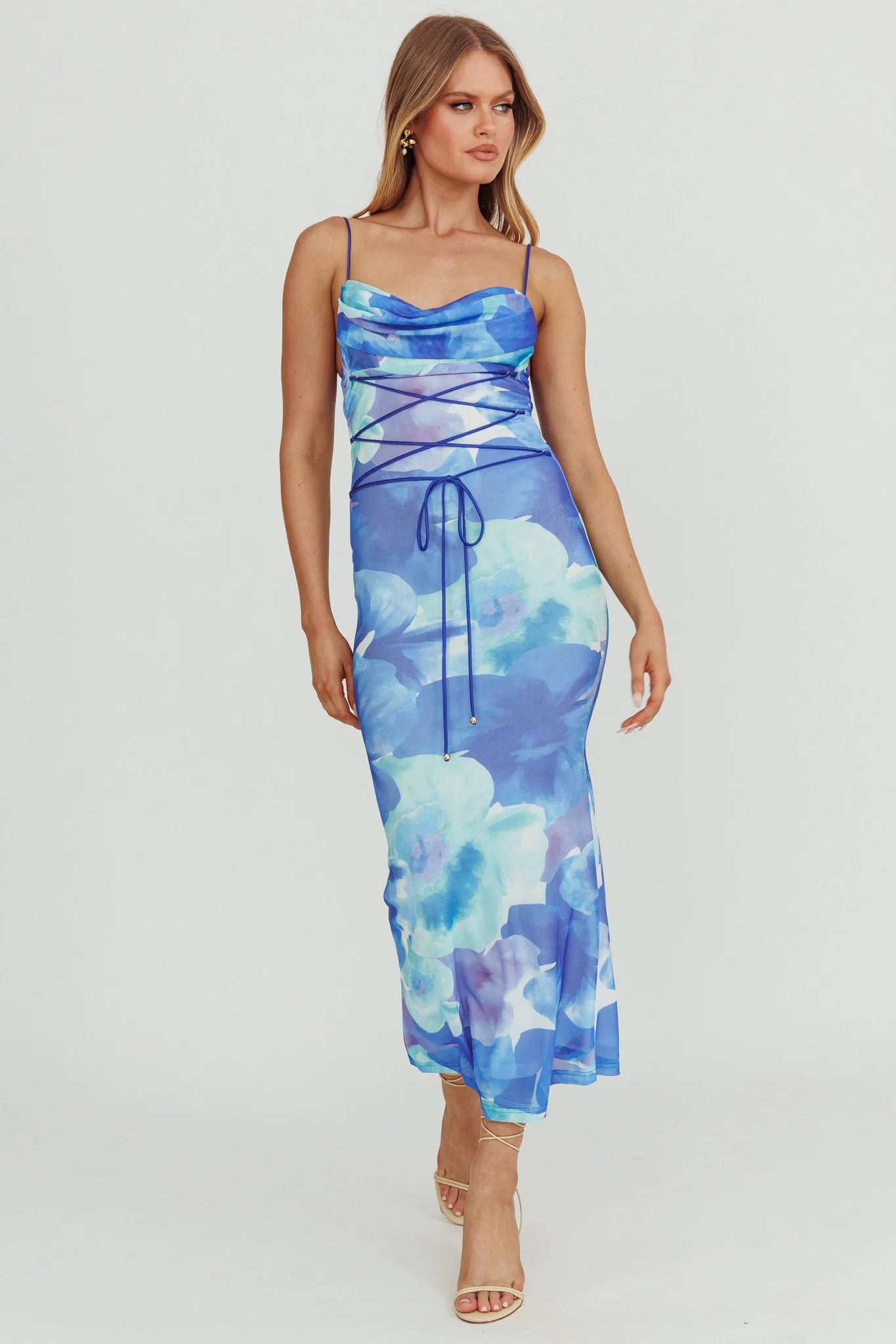 Home Teava Laced Waist Maxi Dress Flowers Blue