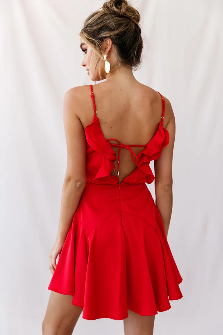 another style within 30 days of receiving your order.You'll be the Lily of the Valley in this pretty dress. Featuring a plunging neckline, fluted swing skirt, separate waist tie with golden toggles and the prettiest ruffle-detail tie-up back. Perfect for cocktails with your girls or an upscale daytime event. Style it with clear heels and stacked gold bangles for a look we are all about!