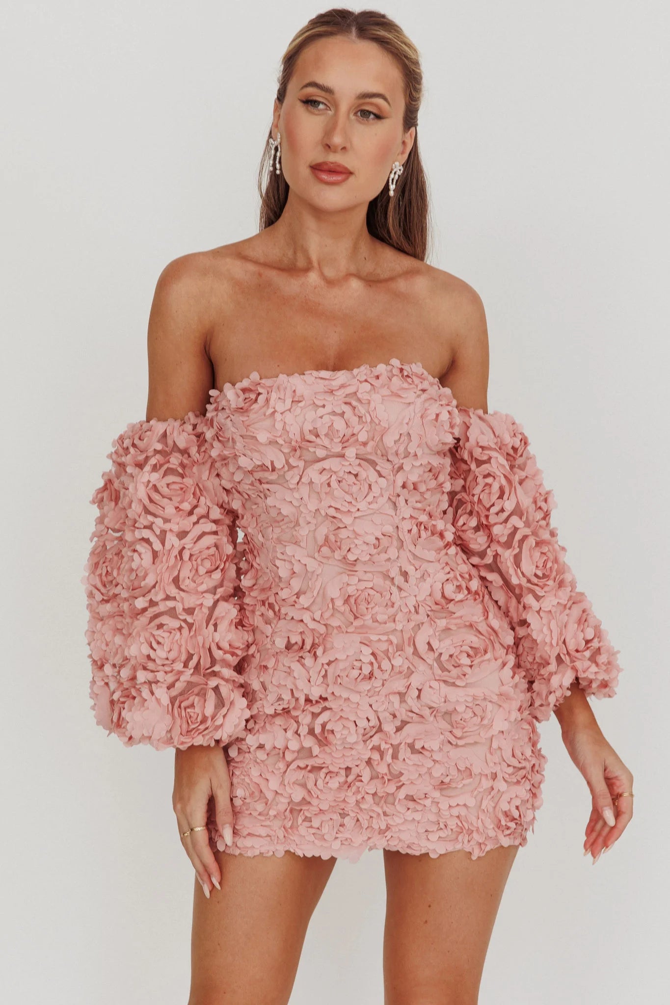 another style within 30 days of receiving your order.You'll be unforgettable in our gorgeous Vive La Rose mini dress. We are obsessed with its floral 3D lace fabric and off shoulder puff sleeves. Perfect for a glam birthday celebration or a special event! Team it with a satin clutch and diamante heels and watch jaws drop.